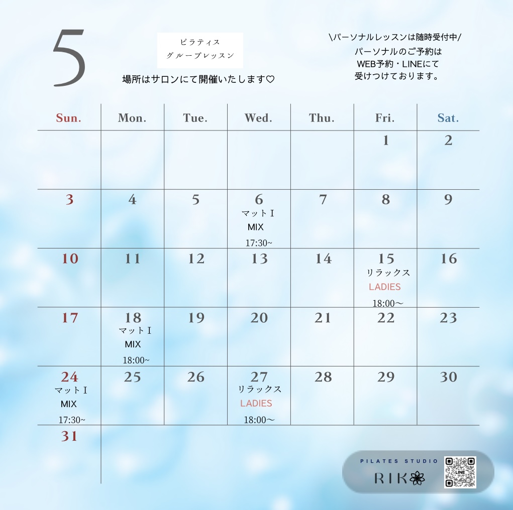 5月のピラティスレッスンのスケジュールを配信致します🌸